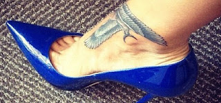 Rihanna fez mais um desenho e mostrou para os fãs neste domingo, dia 17, com uma foto no Twitter. Dessa vez, Rihanna tatuou um falcão egípcio preto e branco na forma de uma pistola, no calcanhar.